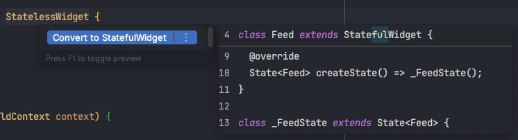 좋아요 기능 구현 좋아요 기능을 구현하기 위해서는 현재 내가 보고 있는 페이지에 상태가 변하기 때문에(어떠한 로직으로 화면의 변화가 생기는것)그 해당 페이지의 State를 바꿔줘야한는데class Feed extends StatelessWidget { const Feed({ super.key, });현재 Feed라는 페이지는 StatelessWidget으로 되어있다. 이것을 안드로이드스튜디오 기준맥 option + Enter / 윈도우 Alt + Enter 를 눌러주면위 사진 처럼 자동으로 StatefulWidget으로 변환하여 줍니다.나도 잘 모르지만 해석해보자면@override = class Feed extends StatelessWidget 을 재정의 하겠다.State createState(..